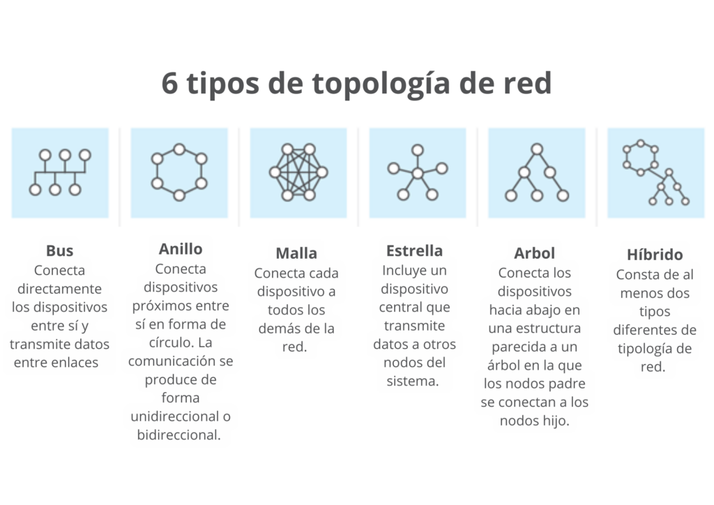 Existen varias formas de unir entre sí los distintos componentes de una red informática. La estructura y las conexiones entre estos elementos vienen definidas por la topología de la red. Antes de profundizar en la seguridad de las redes, se pueden citar los siguientes ejemplos de topologías de red que pueden utilizarse en las PYME. La disposición de una red que comprende nodos y líneas de conexión a través de emisor y receptor se denomina Topología de Red. Las distintas topologías de red son: