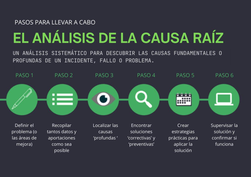 Análisis de la causa raíz (ACR): El ACR es el proceso de identificación de las razones subyacentes del incidente. Implica examinar por qué se produjo el incidente y cómo accedieron los autores de la amenaza. Técnicas como los cinco porqués, el análisis del árbol de fallos o los diagramas de espina de pescado pueden ayudar a rastrear la causa raíz. Comprender la causa raíz es crucial para desarrollar estrategias de mitigación eficaces para evitar que se repita.