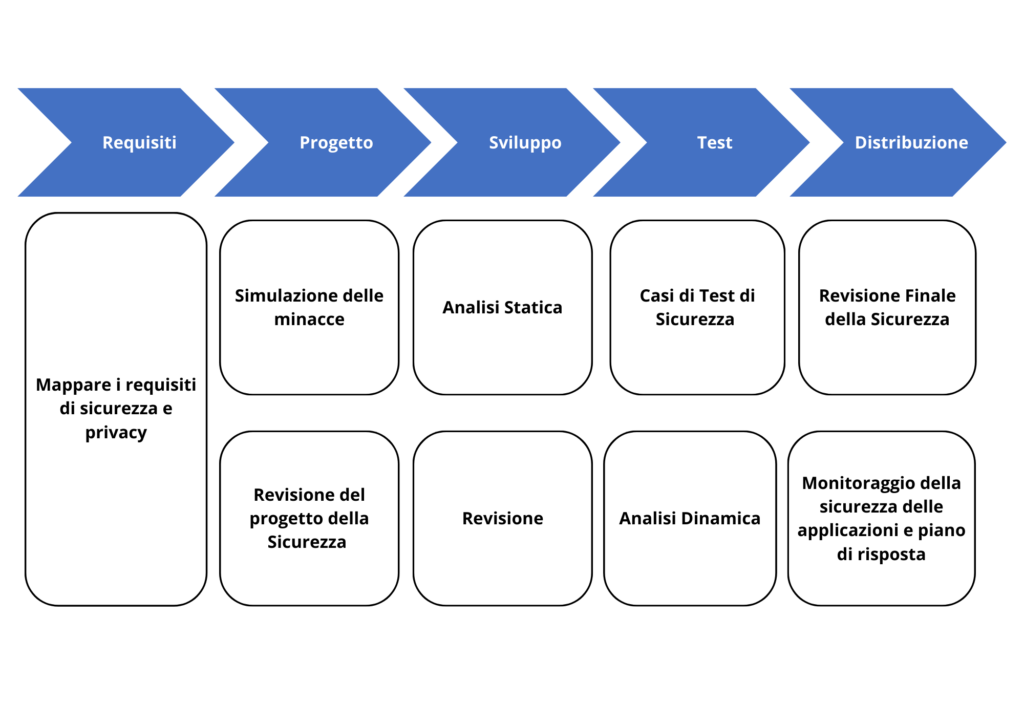 Integrazione proattiva della sicurezza: si tratta di considerare le implicazioni per la sicurezza durante la fase di progettazione, di scegliere framework e librerie sicuri e di garantire che i requisiti di sicurezza siano definiti insieme ai requisiti funzinali.